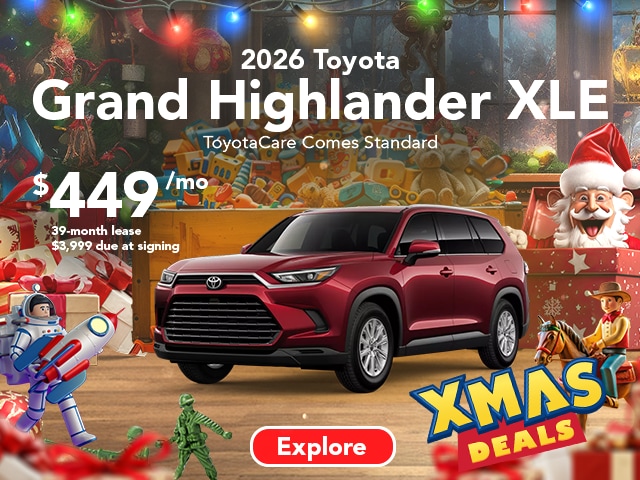 2026 Grand Highlander XLE ToyotaCare Comes Standard. $449/month. 39-month lease. $3,999 due at signing. Terms available on approved credit through Toyota Financial Services (TFS) at participating Toyota dealers. Not all customers qualify. Lease example based on 2026 Grand Highlander 4WD Wagon XLE L4 8AT Model 6708 with Total SRP of $48,043, net capitalized cost of $42,822, and a lease end purchase amount of $33,630. $3,999 Due At Signing includes $3,550 customer down payment and first month's payment of $449. Dealer contribution may vary and could affect lease payment. Individual dealer prices, monthly payment, and other terms and offers may vary. Must lease from participating dealer's stock and terms are subject to vehicle availability. Lessee responsible for maintenance, excess wear and use, and will pay $0.15 per mile for all mileage over 10,000 miles per year. $350 disposition fee is due at lease end. Cannot be combined with TFS Finance Cash, Down Payment Assistance, Trade-in Assistance, Customer Cash, APR, Finance Subvention Cash. Offer available in CT, NJ, NY regardless of buyer's residency; void where prohibited. Expires 01-05-2026. Dealer sets final price. See your participating Toyota dealer for details. Toyota Financial Services is a service mark used by Toyota Motor Credit Corporation (TMCC). Retail installment accounts may be owned by TMCC or its securitization affiliates and lease accounts may be owned by Toyota Lease Trust (TLT) or its securitization affiliates. TMCC is the servicer for accounts owned by TMCC, TLT, and their securitization affiliates. Limited Quantities Available. Lease does not include taxes, license, title fees, acquisition fee of $650, insurance, regionally required equipment and other dealers' charges are extra and not included in the amounts shown. Closed-end lease. Payment may vary depending upon final transaction price. Limited Quantities Available. ToyotaCare Covers normal factory scheduled service. Plan is 2 years or 25K miles, whichever comes first. The new Toyota vehicle cannot be part of a rental or commercial fleet, or a livery or taxi vehicle. See plan for complete coverage details. See participating Toyota dealer for details. Valid only in the continental United States and Alaska.http://www.toyota.com/toyota-care/. Excludes tax, title, license, and registration fees. All vehicles include a $175 dealer fee. Offer Expires 01-05-2026.