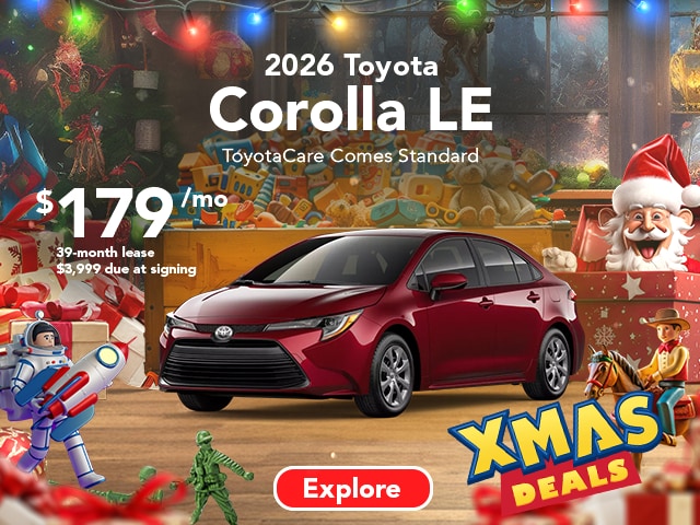 2026 Corolla LE ToyotaCare Comes Standard $179/ mo. 39-month lease. $3,999 due at signing. Terms available on approved credit through Toyota Financial Services (TFS) at participating Toyota dealers. Not all customers qualify. Lease example based on 2026 Corolla 2WD 4Dr. Sedan LE L4 CVT-F Model 1852 with Total SRP of $24,394, net capitalized cost of $19,882, and a lease end purchase amount of $16,100. $3,999 Due At Signing includes $3,820 customer down payment and first month's payment of $179. Dealer contribution may vary and could affect lease payment. Individual dealer prices, monthly payment, and other terms and offers may vary. Must lease from participating dealer's stock and terms are subject to vehicle availability. Lessee responsible for maintenance, excess wear and use, and will pay $0.15 per mile for all mileage over 10,000 miles per year. $350 disposition fee is due at lease end. Cannot be combined with TFS Finance Cash, Down Payment Assistance, Trade-in Assistance, Customer Cash, APR, Finance Subvention Cash. Offer available in CT, NJ, NY regardless of buyer's residency; void where prohibited. Expires 01-05-2026. Dealer sets final price. See your participating Toyota dealer for details. Toyota Financial Services is a service mark used by Toyota Motor Credit Corporation (TMCC). Retail installment accounts may be owned by TMCC or its securitization affiliates and lease accounts may be owned by Toyota Lease Trust (TLT) or its securitization affiliates. TMCC is the servicer for accounts owned by TMCC, TLT, and their securitization affiliates. Limited Quantities Available. Lease does not include taxes, license, title fees, acquisition fee of $650, insurance, regionally required equipment and other dealers' charges are extra and not included in the amounts shown. Closed-end lease. Payment may vary depending upon final transaction price. Limited Quantities Available. ToyotaCare Covers normal factory scheduled service. Plan is 2 years or 25K miles, whichever comes first. The new Toyota vehicle cannot be part of a rental or commercial fleet, or a livery or taxi vehicle. See plan for complete coverage details. See participating Toyota dealer for details. Valid only in the continental United States and Alaska.http://www.toyota.com/toyota-care/. $0 security deposit required. Excludes tax, title, license, and registration fees. All vehicles include a $175 dealer fee. Offer Expires 01-05-2026.
