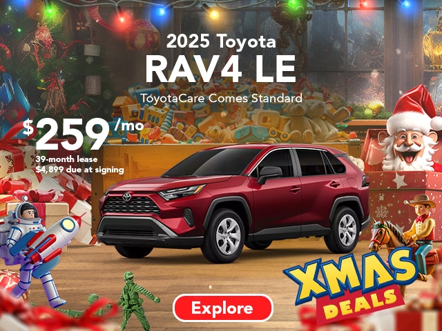 2025 RAV4 LEToyotaCare Comes Standard. $259/mo. 39-month lease. $3,999 due at signing. Terms available on approved credit through Toyota Financial Services (TFS) at participating Toyota dealers. Not all customers qualify. Lease example based on 2025 RAV4 4WD 5Dr. Wagon LE L4 8AT Model 4432 with Total SRP of $32,729, net capitalized cost of $27,079, and a lease end purchase amount of $21,928. $4,899 Due At Signing includes $4,640 customer down payment and first month's payment of $259. Dealer contribution may vary and could affect lease payment. Individual dealer prices, monthly payment, and other terms and offers may vary. Must lease from participating dealer's stock and terms are subject to vehicle availability. Lessee responsible for maintenance, excess wear and use, and will pay $0.15 per mile for all mileage over 10,000 miles per year. $350 disposition fee is due at lease end. Cannot be combined with TFS Finance Cash, Down Payment Assistance, Trade-in Assistance, Customer Cash, APR, Finance Subvention Cash. Offer available in CT, NJ, NY regardless of buyer's residency; void where prohibited. Expires 01-05-2026. Dealer sets final price. See your participating Toyota dealer for details. Toyota Financial Services is a service mark used by Toyota Motor Credit Corporation (TMCC). Retail installment accounts may be owned by TMCC or its securitization affiliates and lease accounts may be owned by Toyota Lease Trust (TLT) or its securitization affiliates. TMCC is the servicer for accounts owned by TMCC, TLT, and their securitization affiliates. Limited Quantities Available. Lease does not include taxes, license, title fees, acquisition fee of $650, insurance, regionally required equipment and other dealers' charges are extra and not included in the amounts shown. Closed-end lease. Payment may vary depending upon final transaction price. Limited Quantities Available. ToyotaCare Covers normal factory scheduled service. Plan is 2 years or 25K miles, whichever comes first. The new Toyota vehicle cannot be part of a rental or commercial fleet, or a livery or taxi vehicle. See plan for complete coverage details. See participating Toyota dealer for details. Valid only in the continental United States and Alaska.http://www.toyota.com/toyota-care/. Excludes tax, title, license, and registration fees. All vehicles include a $175 dealer fee. Offer Expires 01-05-2026.