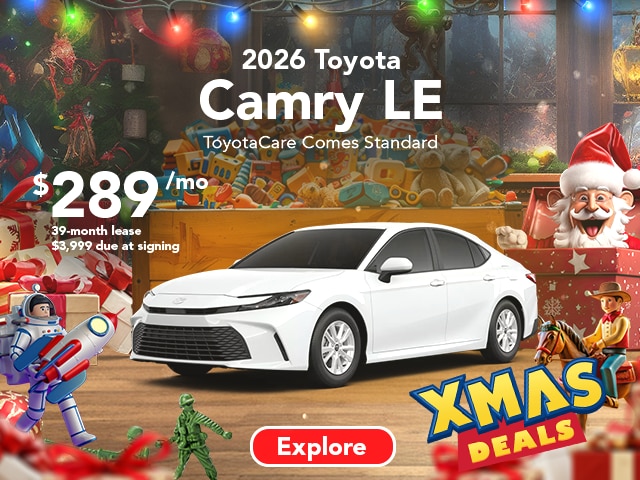 2026 Camry Hybrid 4WD LEToyotaCare Comes Standard. $289/mo. 39-month lease $3,999 due at signing. Terms available on approved credit through Toyota Financial Services (TFS) at participating Toyota dealers. Not all customers qualify. Lease example based on 2026 Camry 4WD 4Dr. Sedan LE Hybrid CVT Model 2552 with Total SRP of $33,089, net capitalized cost of $27,984, and a lease end purchase amount of $22,170. $3,999 Due At Signing includes $3,710 customer down payment and first month's payment of $289. Dealer contribution may vary and could affect lease payment. Individual dealer prices, monthly payment, and other terms and offers may vary. Must lease from participating dealer's stock and terms are subject to vehicle availability. Lessee responsible for maintenance, excess wear and use, and will pay $0.15 per mile for all mileage over 10,000 miles per year. $350 disposition fee is due at lease end. Cannot be combined with TFS Finance Cash, Down Payment Assistance, Trade-in Assistance, Customer Cash, APR, Finance Subvention Cash. Excludes 2WD 4Dr. Sedan XSE Hybrid CVT, 2WD 4Dr. Sedan XLE Hybrid CVT, 4WD 4Dr. Sedan XLE Hybrid CVT, 4WD 4Dr. Sedan XSE Hybrid CVT, 4WD 4Dr. Sedan NIGHTSHADE Hybrid CVT, 2WD 4Dr. Sedan NIGHTSHADE Hybrid CVT. Offer available in CT, NJ, NY regardless of buyer's residency; void where prohibited. Expires 01-05-2026. Dealer sets final price. See your participating Toyota dealer for details. Toyota Financial Services is a service mark used by Toyota Motor Credit Corporation (TMCC). Retail installment accounts may be owned by TMCC or its securitization affiliates and lease accounts may be owned by Toyota Lease Trust (TLT) or its securitization affiliates. TMCC is the servicer for accounts owned by TMCC, TLT, and their securitization affiliates. Limited Quantities Available. Lease does not include taxes, license, title fees, acquisition fee of $650, insurance, regionally required equipment and other dealers' charges are extra and not included in the amounts shown. Closed-end lease. Payment may vary depending upon final transaction price. Limited Quantities Available. ToyotaCare Covers normal factory scheduled service. Plan is 2 years or 25K miles, whichever comes first. The new Toyota vehicle cannot be part of a rental or commercial fleet, or a livery or taxi vehicle. See plan for complete coverage details. See participating Toyota dealer for details. Valid only in the continental United States and Alaska.http://www.toyota.com/toyota-care/. $0 security deposit required. Excludes tax, title, license, and registration fees. All vehicles include a $175 dealer fee. Offer Expires 01-05-2026.